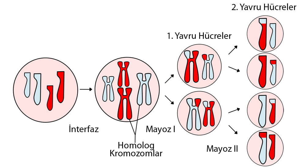 Bir hücre mayoz – 1 ve mayoz – 2 olmak üzere iki kez üst üste bölünür. Mayoz – 1 de kromozom sayısı yarıya indirilir. Mitoz bölünmede olduğu gibi mayozla bölünecek hücre, önce interfaz evresini geçirerek büyür ve olgunlaşır.